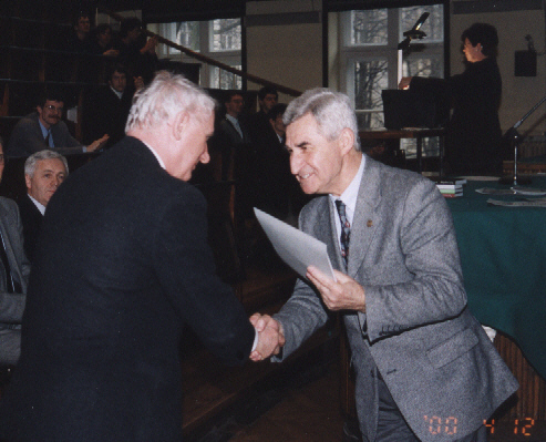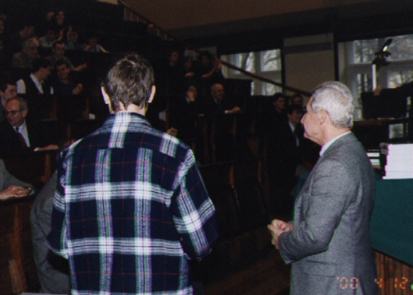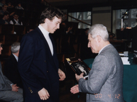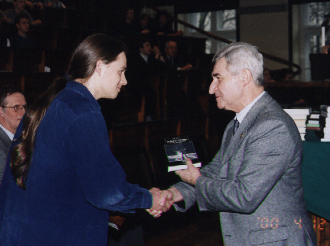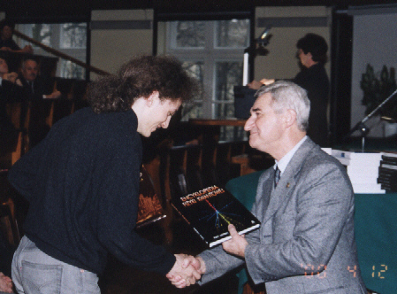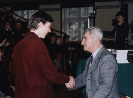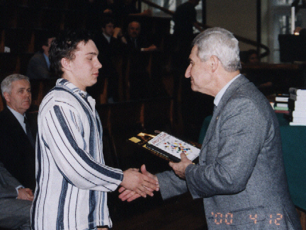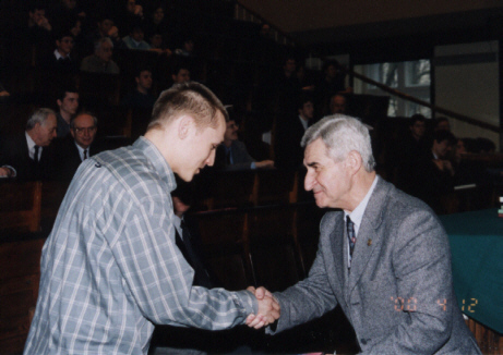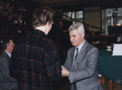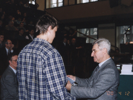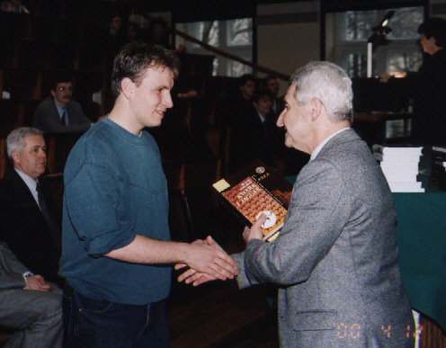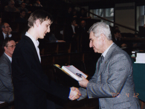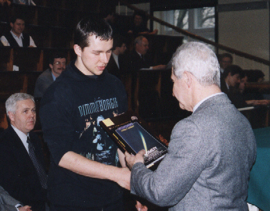 Lecz oto nadeszła najważniejsza chwila, gdy pojawił się zwycięzca VI Konkursu Fizycznego - Szymon Jakubczak z XIV LO im. Staszica (uczeń Elżbiety Zawistowskiej) i odebrał dyplom, upoważnienie do przyjęcia na Wydział Fizyki PW bez egzaminów wstępnych, nagrodę książkową, uścisk dłoni i gratulacje Prezesa Polskiego Towarzystwa Fizycznego prof. Ireneusza Strzałkowskiego: