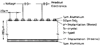 Cienki (kilkaset mikrometrów) detektor krzemowy, jedna z elektrod odczytowych (od strony dużej koncentracji domieszek) ma postać szeregu cienkich
